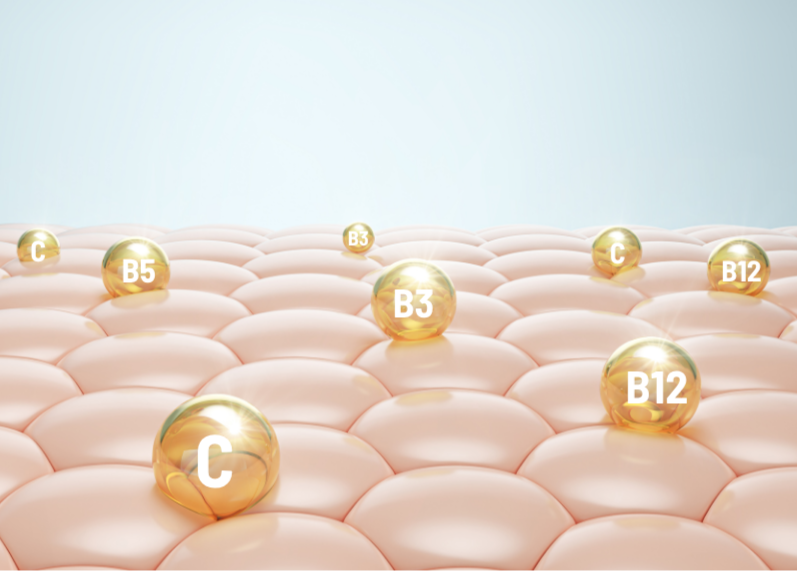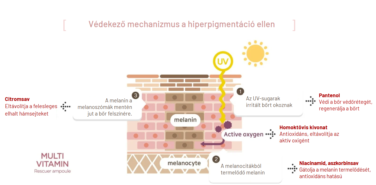 A B3, B5, B12, és C-vitamin mellett a homoktövis, a niacinamid és a pantenol együttes hatásával kezeli a hiperpigmentációt.